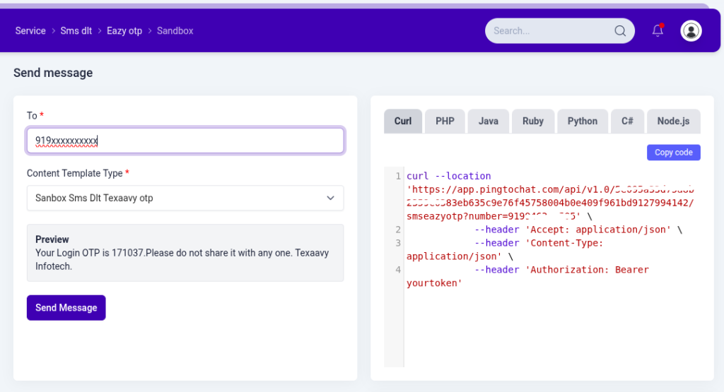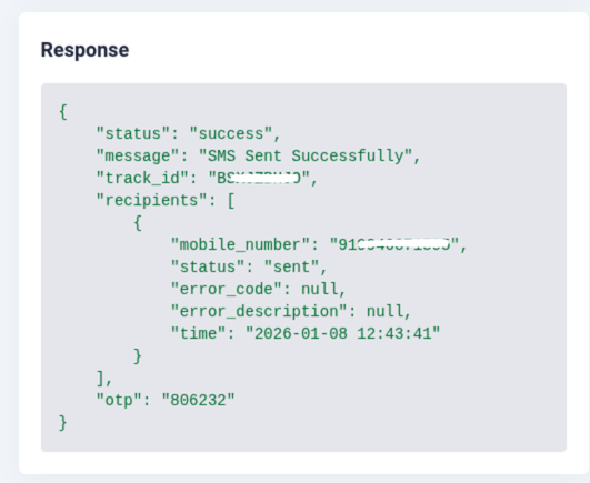 Send sandbox OTP message Estimated reading: 1 minute 9 views Overview SMS DLT – Eazy OTP is a service that enables sending DLT-compliant One-Time Passwords (OTP) via SMS for user verification and authentication.This service follows DLT (Distributed Ledger Technology) regulations, ensuring OTP messages are sent using approved templates, headers, and registered entities. The service includes a Sandbox Demo for testing OTP delivery. Once activated and approved, OTP messages can be sent in both testing and live environments. Accessing SMS DLT – Eazy OTP Service Steps to Access the Service Log in to the Admin Panel Navigate to the Side Menu Select Services Click on SMS DLT Choose Eazy OTP Sandbox Limitations Only one mobile number can be used Intended for testing purposes only Service activation is mandatory before use Sending OTP Message Steps to Send OTP Open SMS DLT → Eazy OTP Enter the mobile number Select the DLT-approved OTP template Click Send Message The OTP message will be delivered to the entered mobile number in compliance with DLT regulations. Example Success response